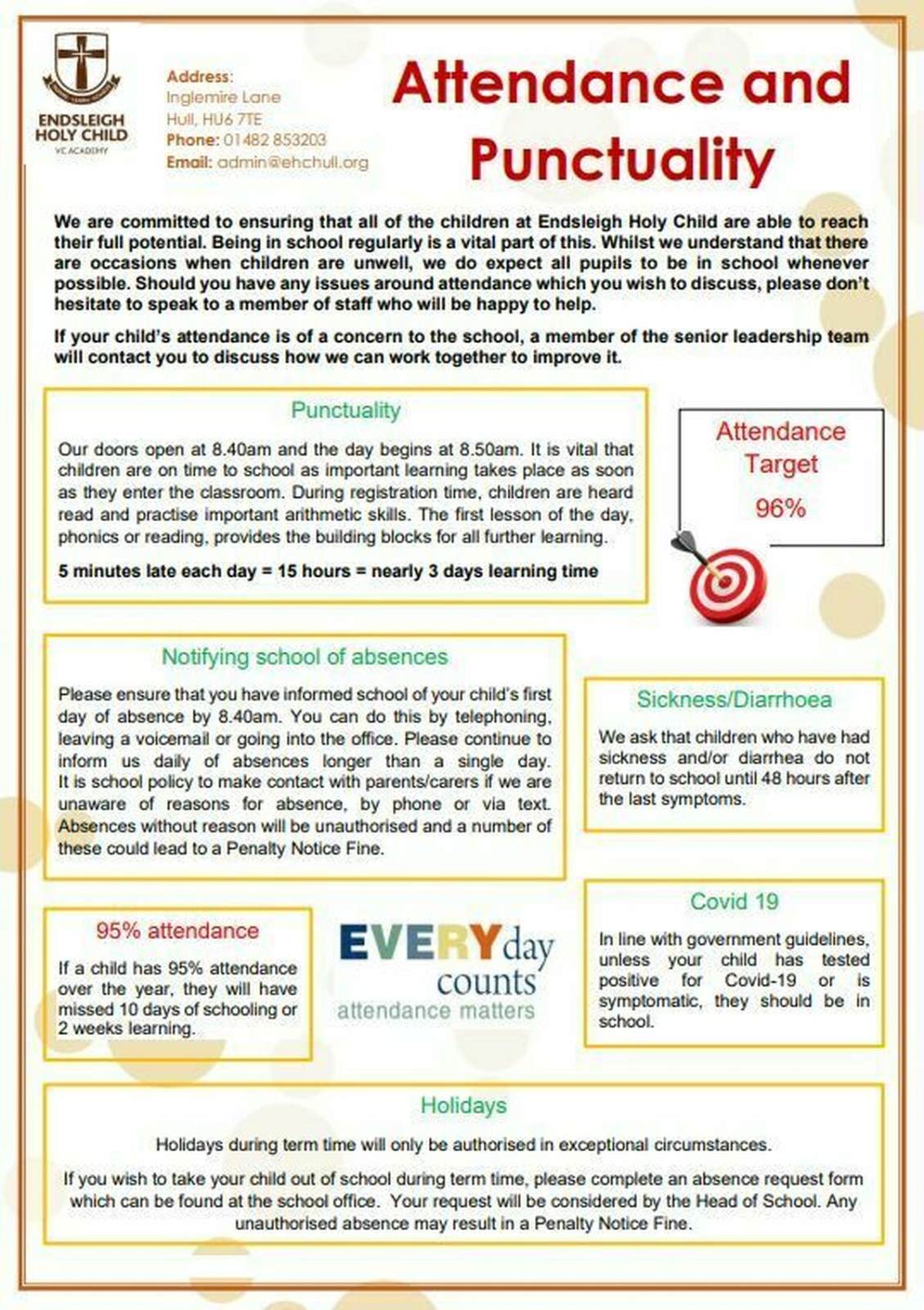 In order to ensure that children reach their true potential, good attendance is essential. Whenever possible, your child should be in school and on time to maximise learning time.